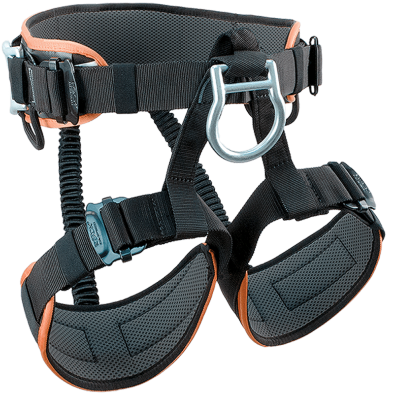 Correa elástica fuerte (estilo acordeón) que conecta las piernas al cinturón en la parte posterior del arnés, que se ajusta automáticamente y asegura un posicionamiento óptimo de las piernas en relación con la cintura en todo momento (especialmente al escalar o sentarse)