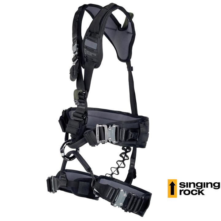 Arnés de seguridad de cuerpo entero ligero y totalmente ajustable destinado principalmente a fuerzas especiales con el sistema MOLLE y la posibilidad de llevar el arnés por encima de un chaleco antibalas. El exclusivo Singing Rock MOTION SYSTEM con la junta tórica RINGO que se puede abrir le da al usuario libertad de movimiento sin estar restringido por una cuerda de trabajo o un sistema de detención de caídas. La solución ideal para situaciones en las que el posicionamiento preciso y la libertad de movimiento son importantes. textil frontal Un punto según EN 361 es regulable verticalmente, lo que permite utilizar el mismo arnés con y sin chaleco antibalas