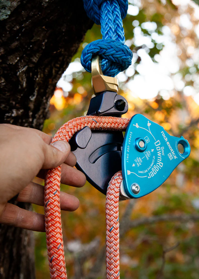 El DownRigger aplica fricción a la línea de aparejo cuando la carga la pesa, lo que permite al operador controlar el descenso con la mano. Sin peso, la línea se retrae fácilmente a través del dispositivo para restablecer el sistema. El DownRigger cuenta con la conocida parte superior giratoria de Rock Exotica que permite una fácil alineación con la carga y la placa lateral de doble bloqueo que hace que la instalación de la cuerda sea más eficiente.