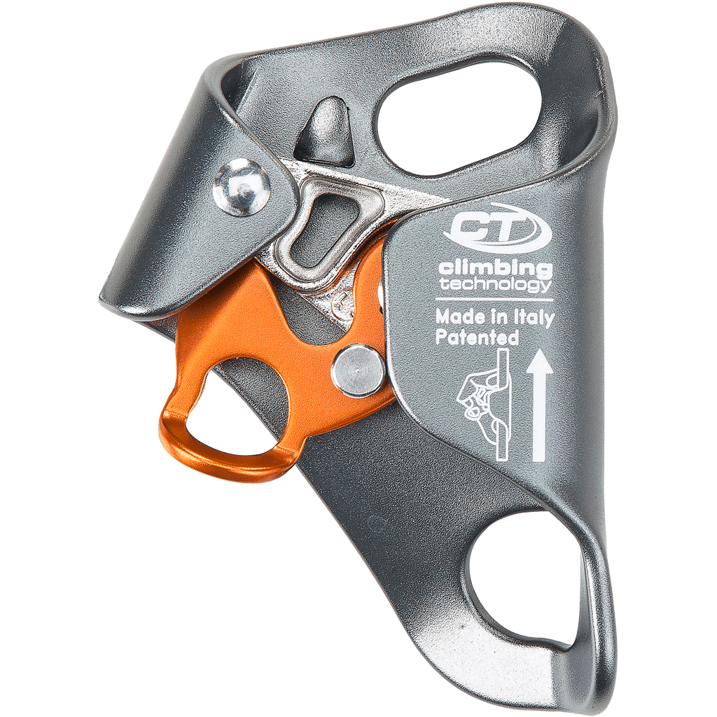 - leva en acero, producida con tecnología que incrementa la resistencia al desgaste. Dotada de una parte dentada que preservan la cuerda del desgaste, pero de igual eficacia en el bloqueo y en la subida por ésta. Además presenta tres orificios para evitar la acumulación de barro y reducir el esfuerzo necesario para que se deslice el dispositivo hacia arriba por la cuerda en cualquier condición (corda embarrada, helada etc);