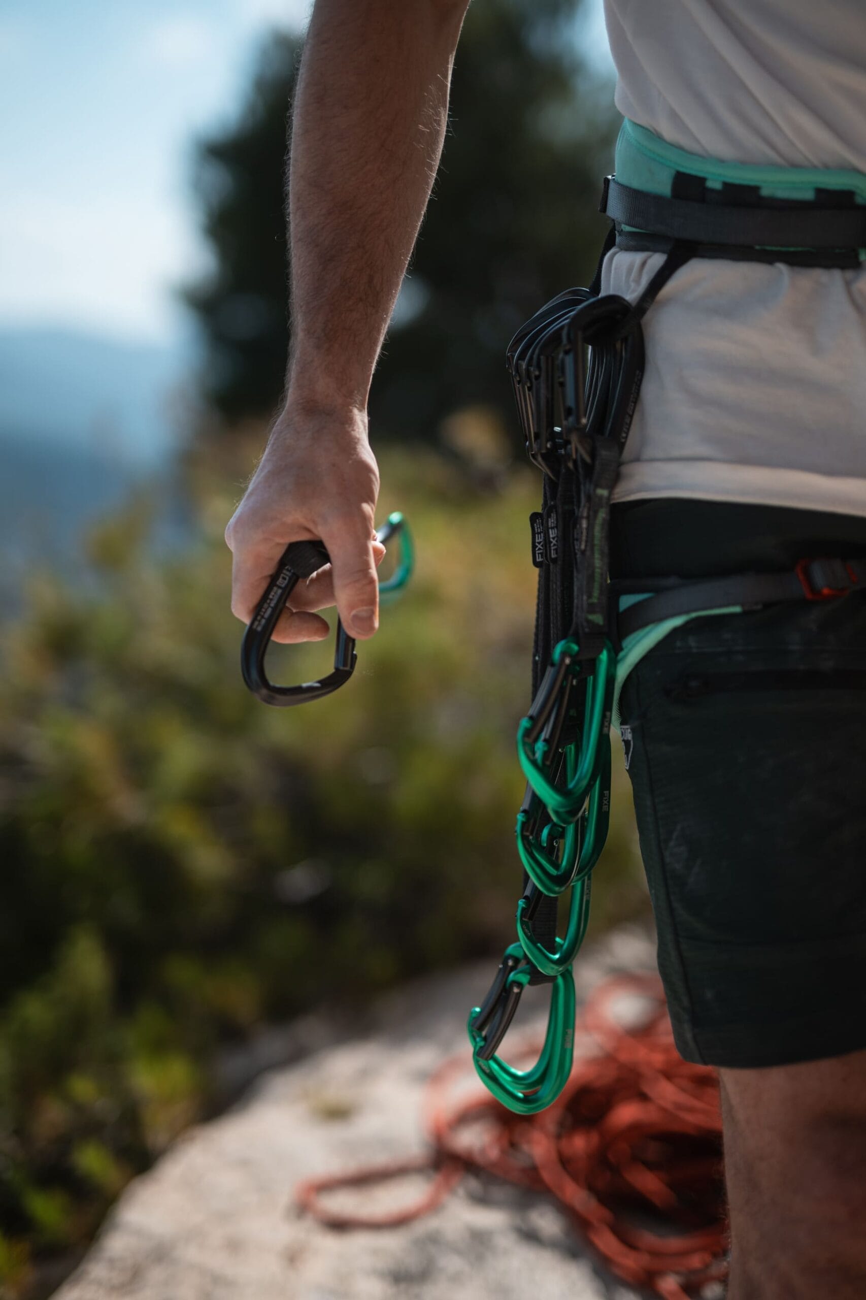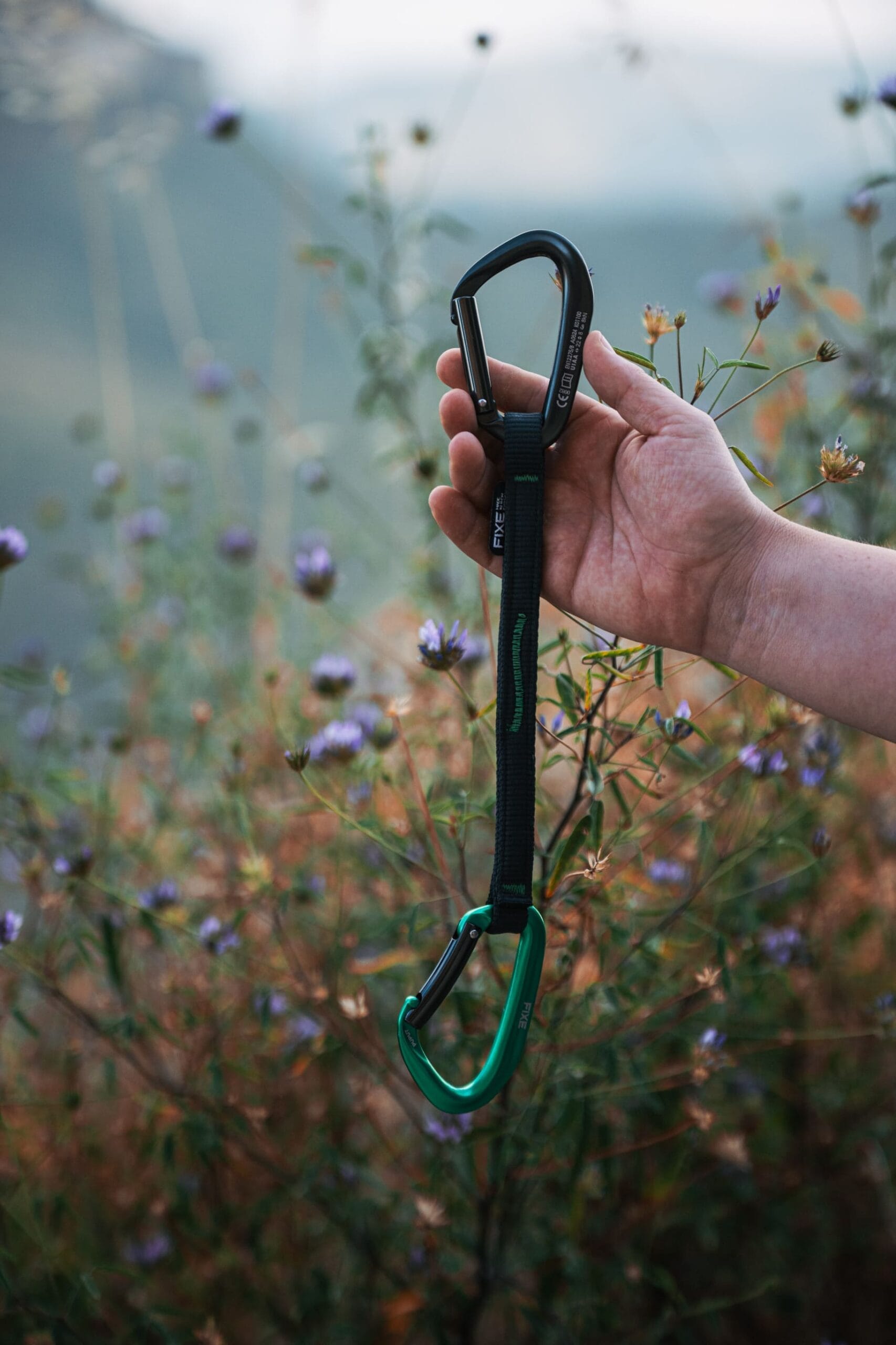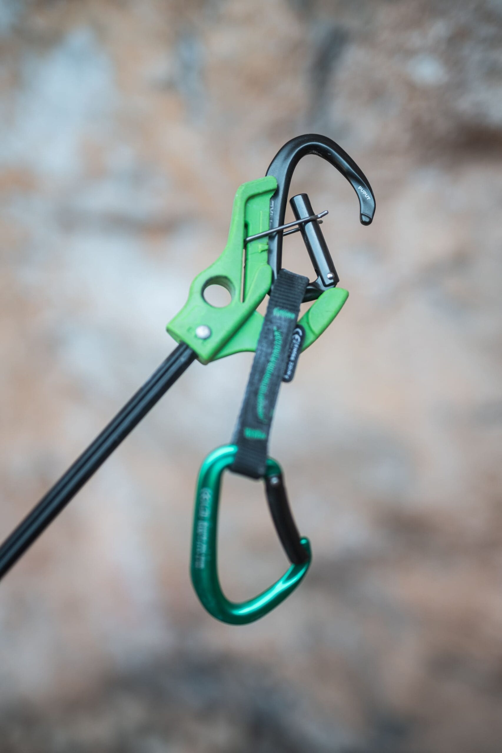 Nariz cónica: Su nariz puntiaguda en forma cónica facilita la inserción del mosquetón a plaquetas, pitones u otros elementos de conexión de forma precisa y fluida sin tropezar con ninguna curva del mosquetón. Al mismo tiempo, esta geometría, permite desmontar la vía con gran comodidad.