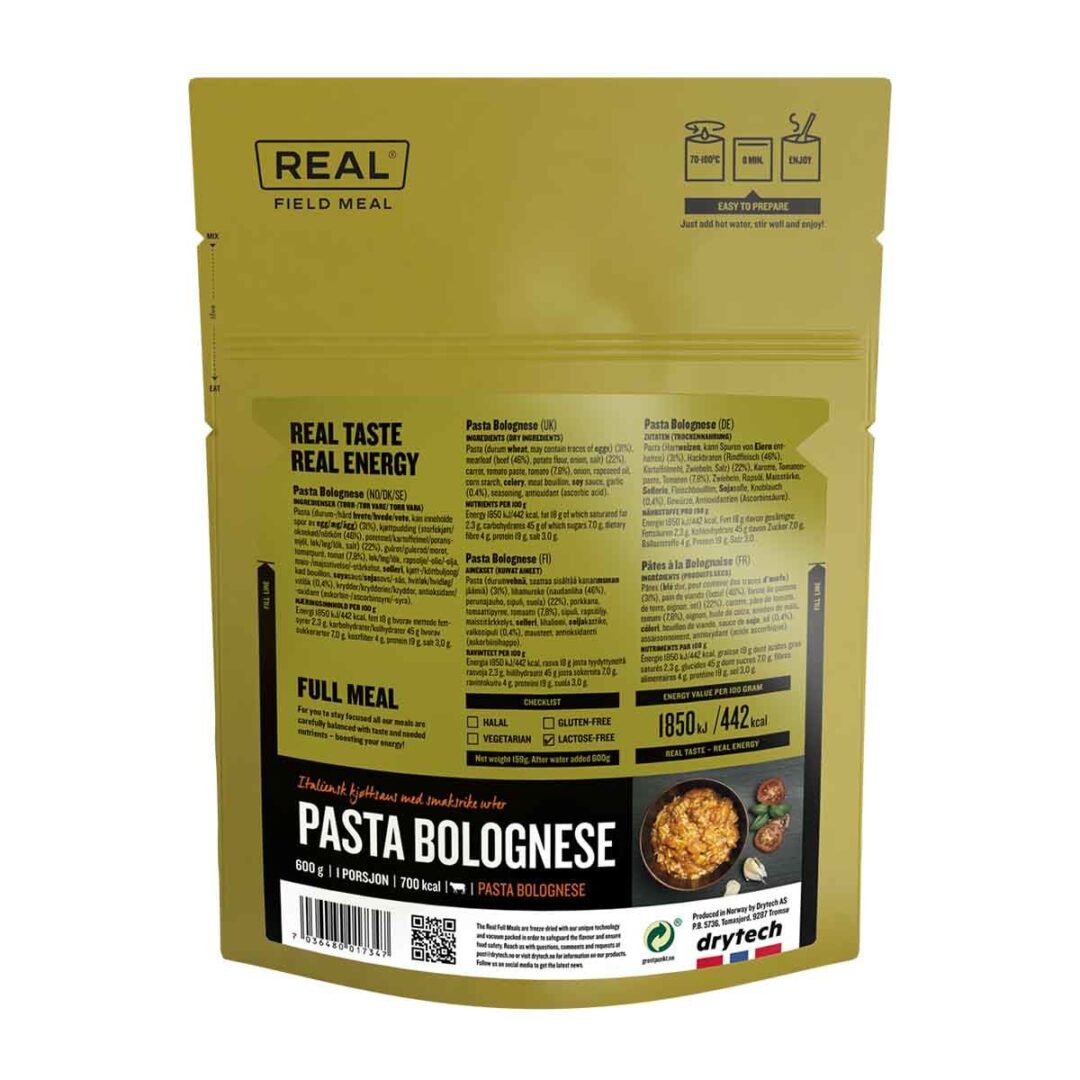 Pasta a la boloñesa de Real Field Meal son sin lactosa. Es una receta cocinada y liofilizada en Noruega. Este plato está muy apreciado por las armadas en Noruega, Suecia y Suiza.