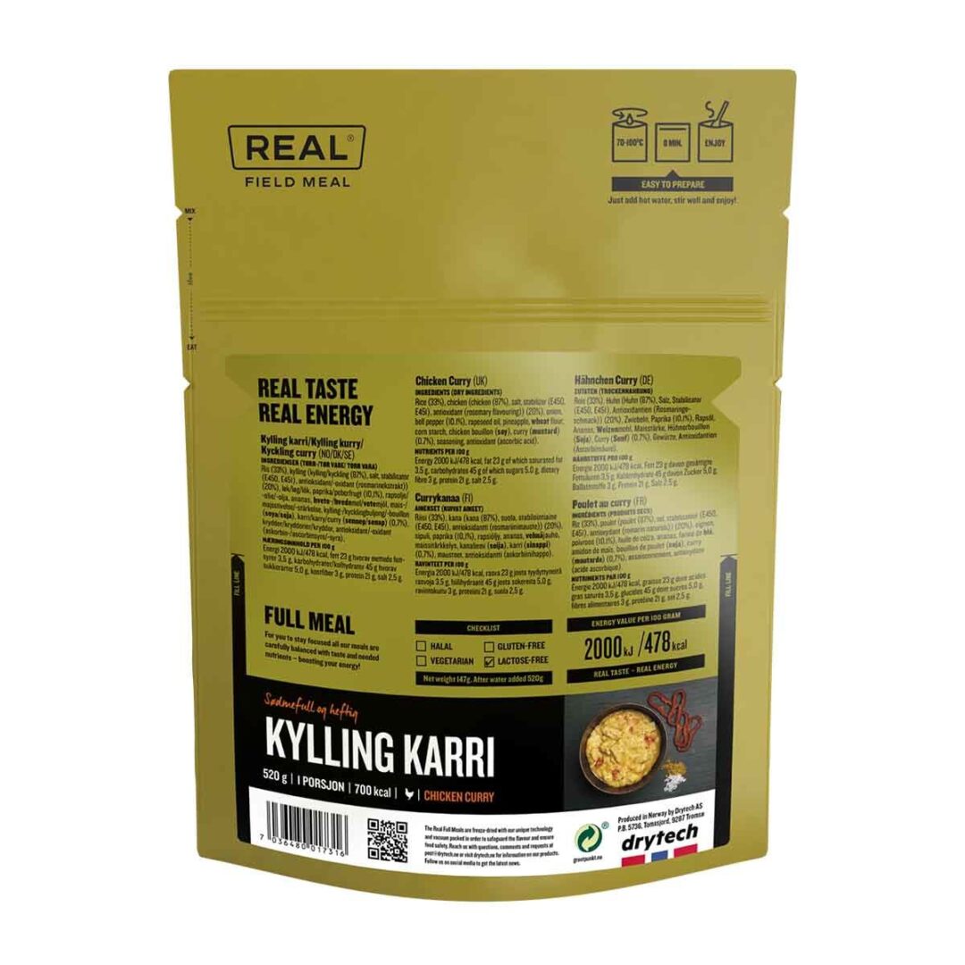 Esta receta liofilizada de Pollo al Curry ha sido preparada en Noruega por la marca Real Field Meals que hace platos para diferentes armadas como en Suiza, Suecia o Noruega.