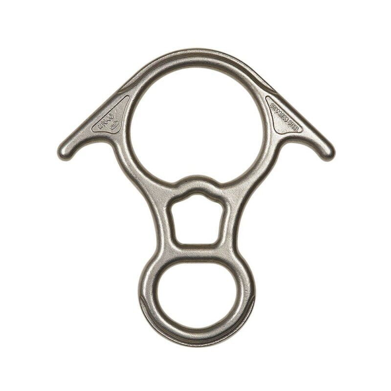Descensor en ocho de grandes dimensiones, forjado en caliente e ideal para asegurar el primero de cordada de forma dinámica y para el descenso en cuerda doble. Para cuerdas hasta 13 mm y resiste un máximo de 40 kN.