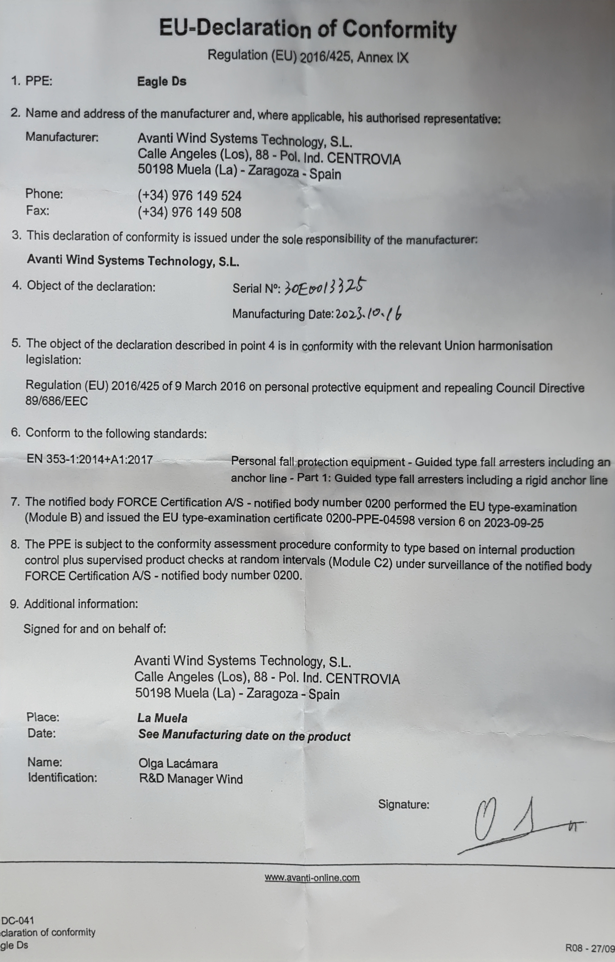 El dispositivo de protección contra caídas AVANTI Eagle DS Runner está especificado para su uso en el sistema de seguridad de escaleras de riel AVANTI. La guía tiene un sistema de doble bloqueo y viene equipada con 6 rodillos para ayudar al dispositivo a seguirle subiendo y bajando la escalera. Si te caes, se bloqueará inmediatamente para limitar tu caída. El dispositivo de protección contra caídas AVANTI Eagle DS Runner se puede colocar y quitar de la barandilla de seguridad en cualquier punto y viene equipado con un paquete de choque y un mosquetón. Se utiliza principalmente en energía eólica o en cualquier otra industria en la que se haya instalado el sistema de seguridad Avanti Rail Ladder.