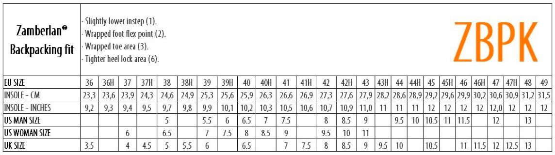 Tabla de tallas (Recuerda que cada modelo de Zamberlan tiene una tabla distinta de medidas!):